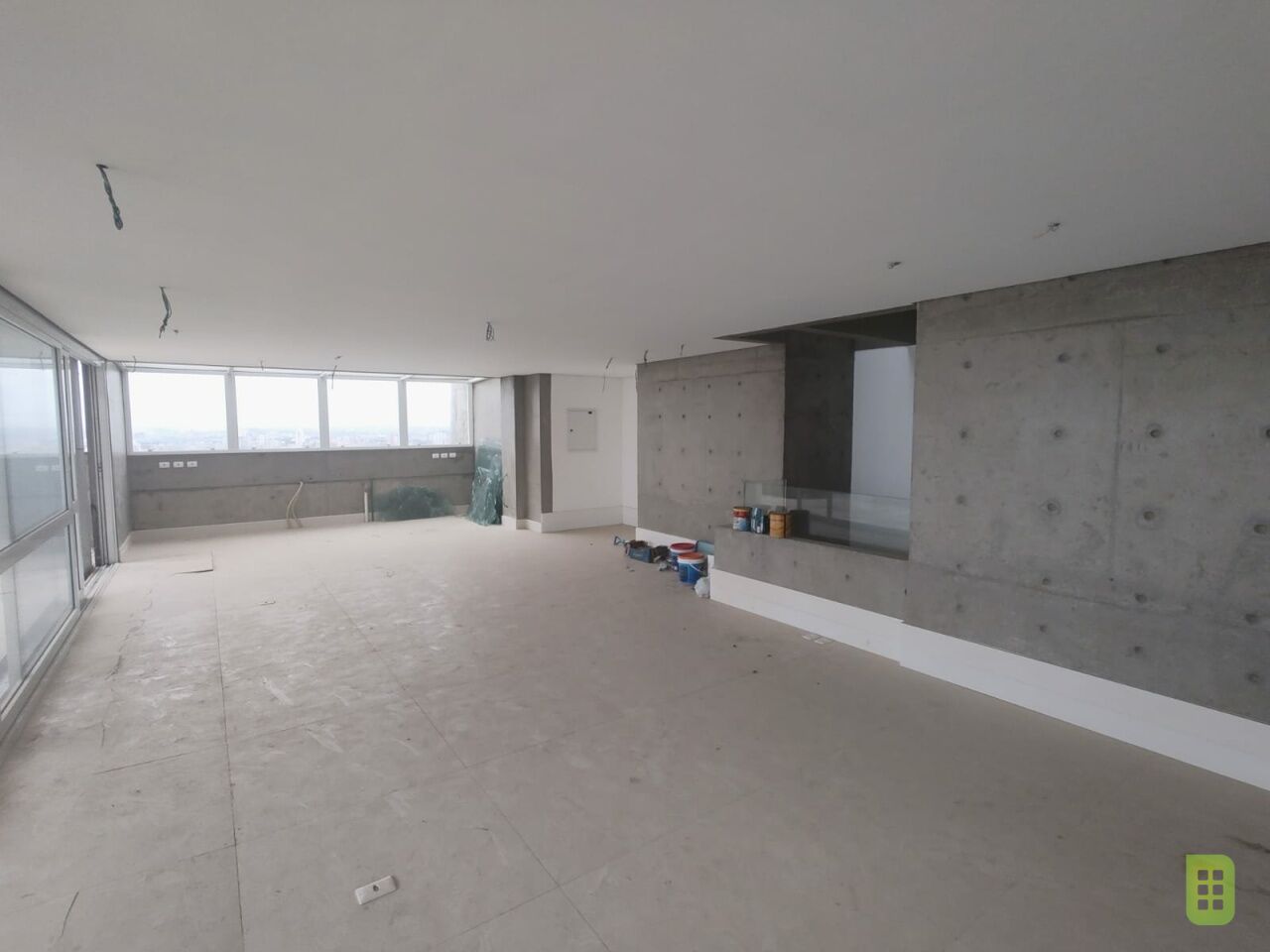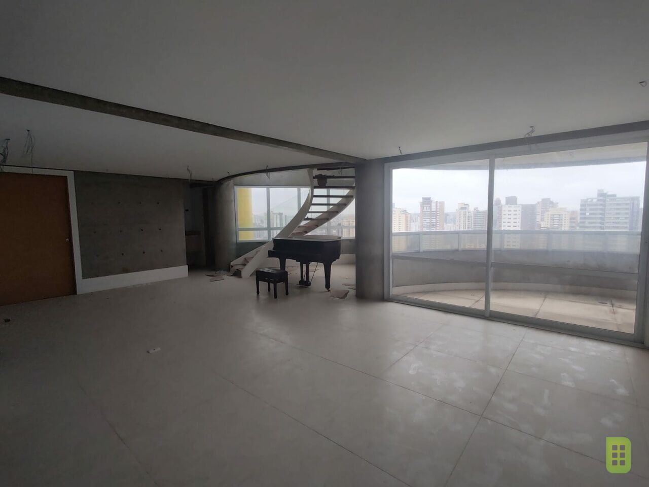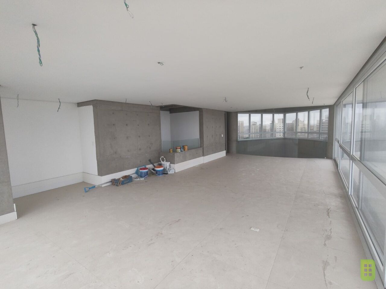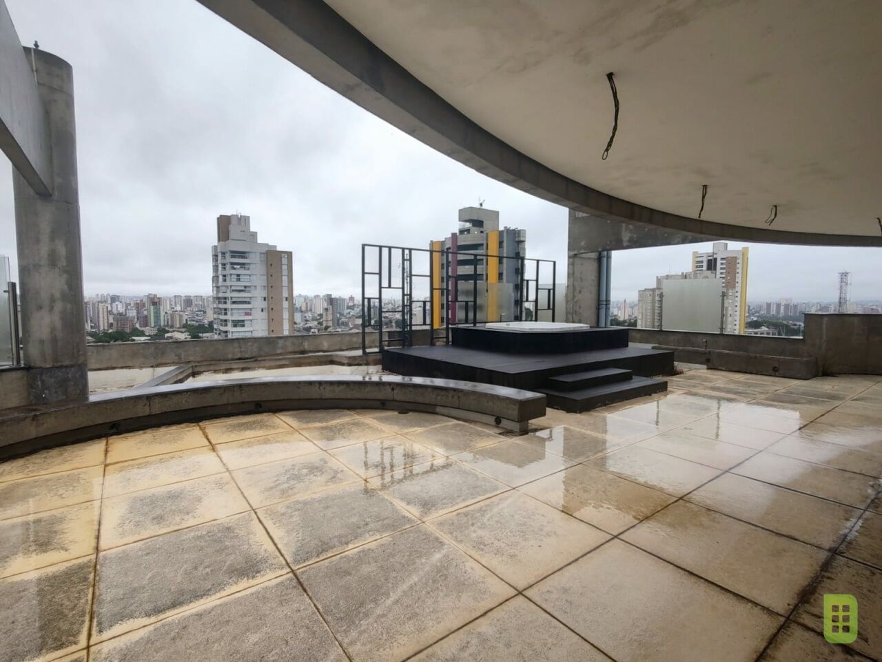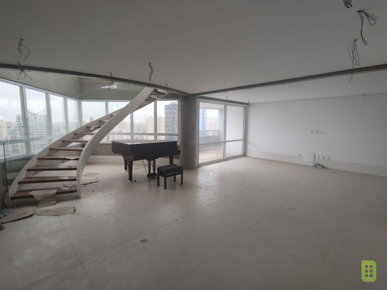 São 460m² divididos em 03 suítes com sacada, sendo 01 suíte master com 02 banheiros e closet, saia 04 ambientes com sacada, lavabo, cozinha independente integrada com a varanda gourmet (com churrasqueira á carvão e fechamento em vidro), dependência de empregada com banheiro e área de serviço. Ampla cobertura com sala de estar, lavabo e área descoberta com hidromassagem, deck e jardim. 06 vagas de garagem.