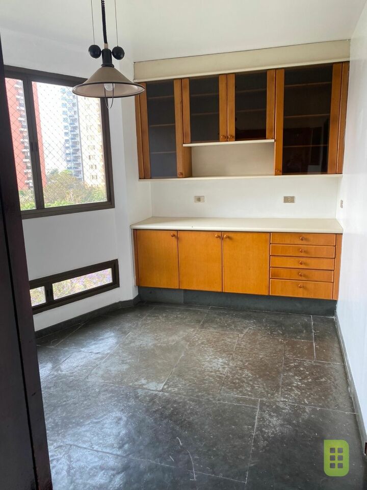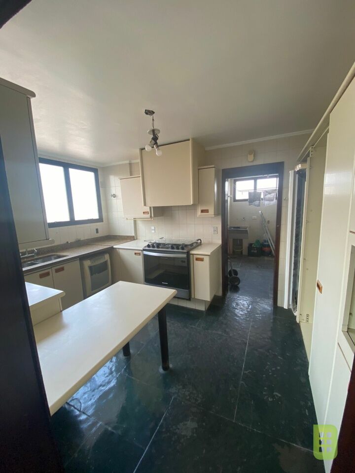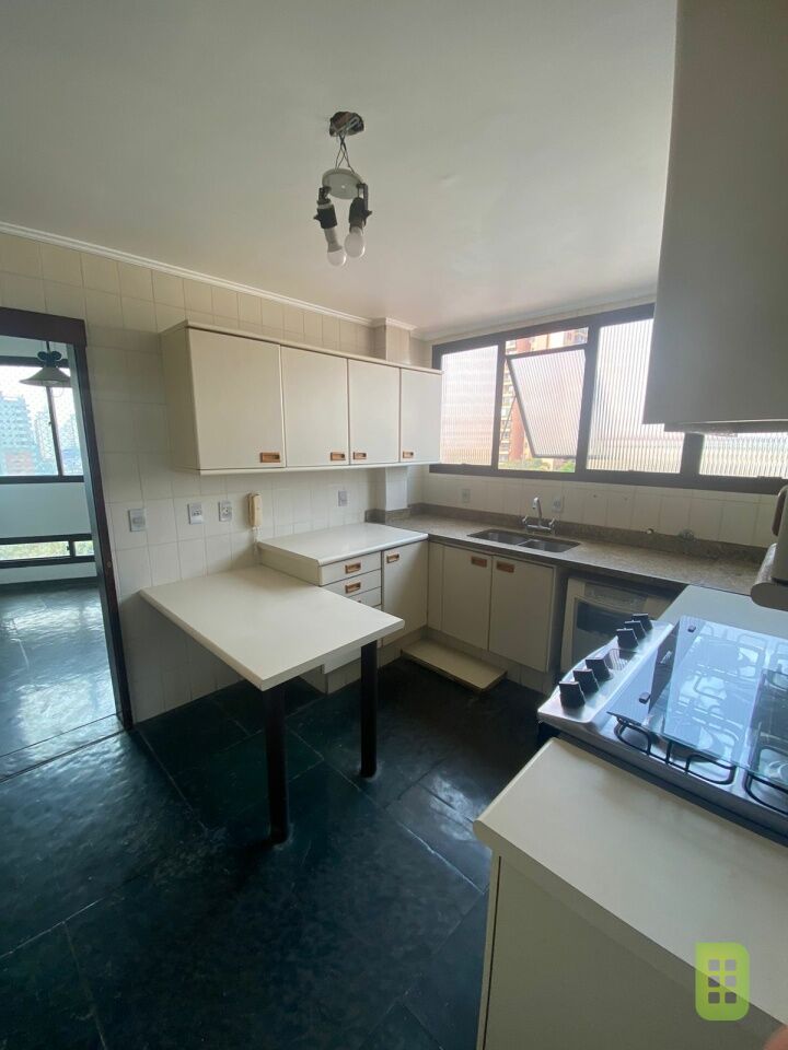 A cozinha repleta de armários possui uma copa para as refeições rápidas do dia a dia.
