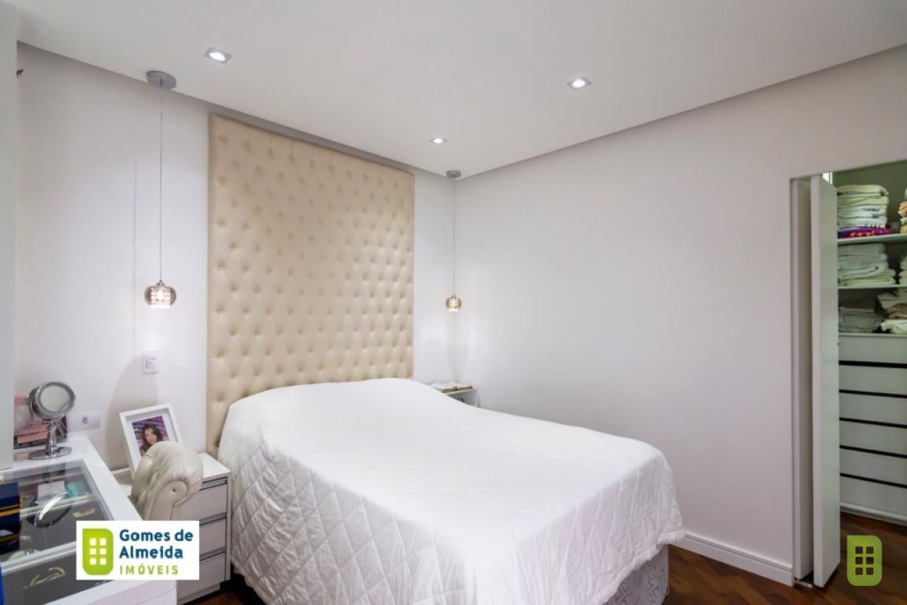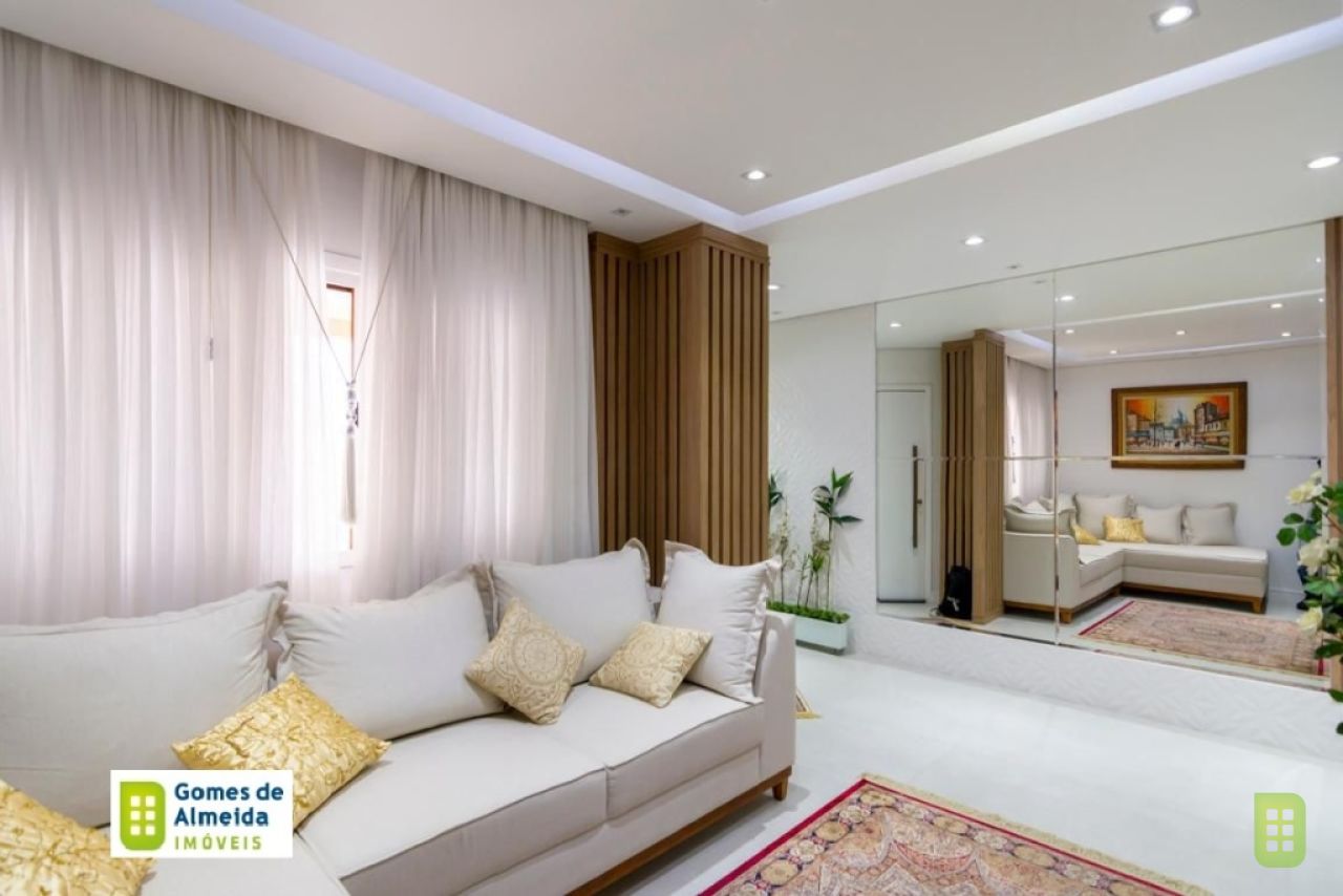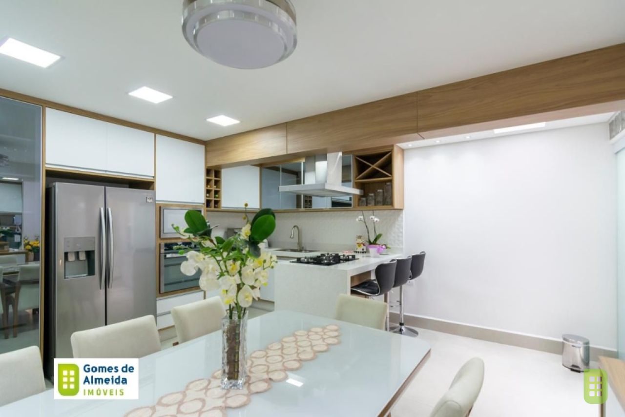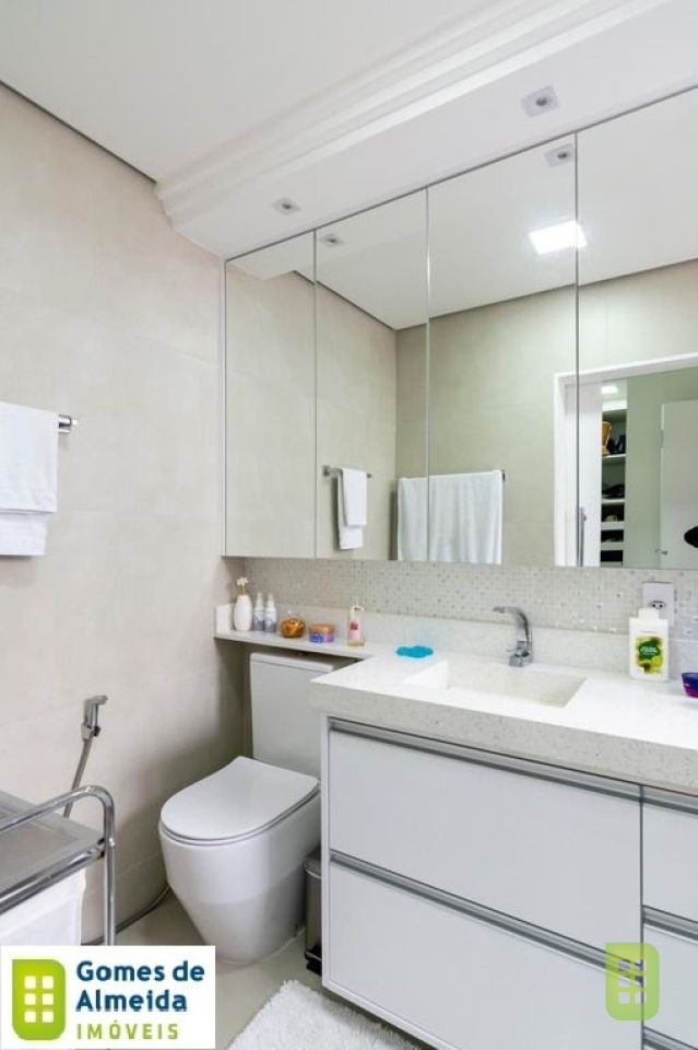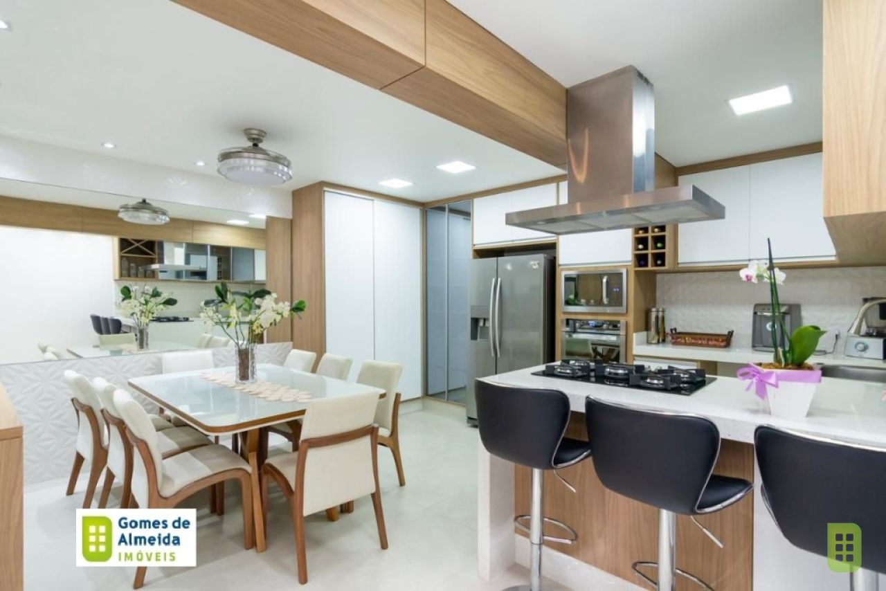 São 03 dormitórios com armários embutidos, sendo 01 suíte master com closet e 01 dormitório com sacada, banheiro social, sala 02 ambientes com lavabo, cozinha gourmet americana planejada e área de serviço com teto retrátil. 03 vagas. 140m²